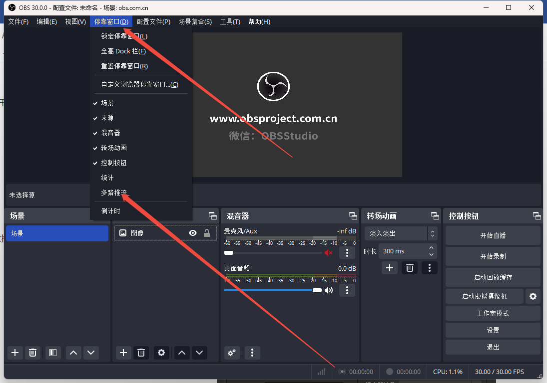 点击菜单栏的 停靠窗口 里面会有多路推流选项 选中以后会出现 可以悬浮窗口拖动到obs左侧 会自动吸附